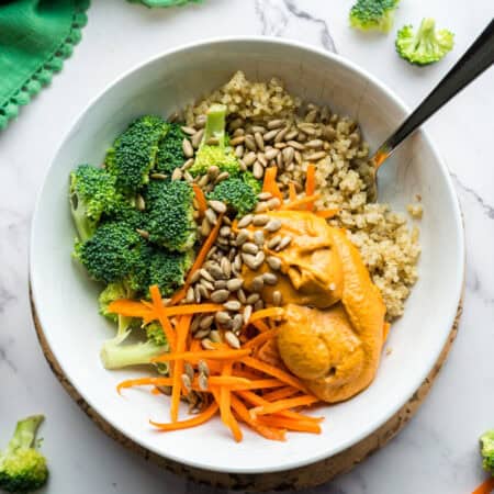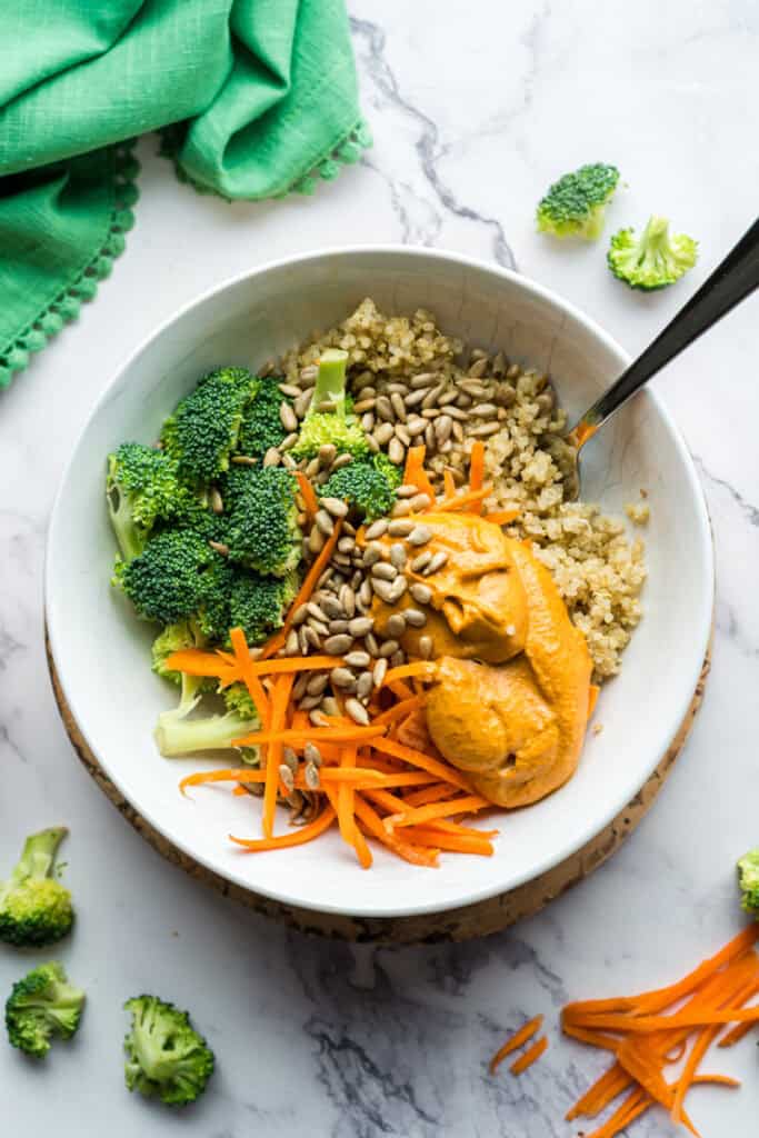 These vegan quinoa power bowls with broccoli, carrots, and a smoky almond chipotle sauce are packed with protein and flavour—perfect for healthy meal prep or weeknight dinners.