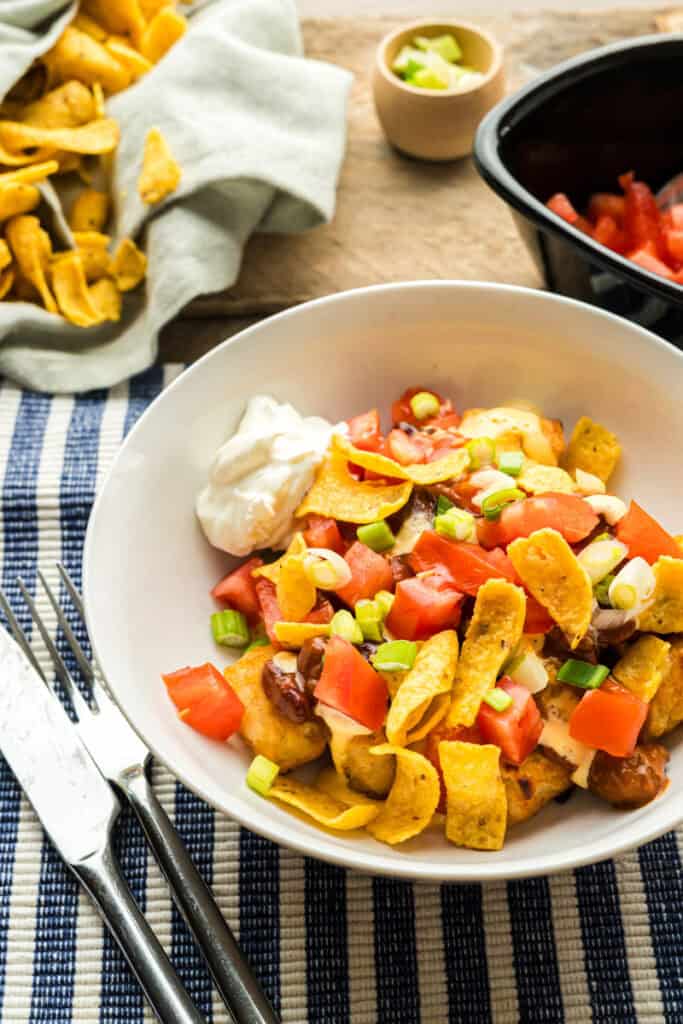 - Once the tater tots and nacho cheese sauce are ready, assemble your bowls by layering tater tots, chili, cheese sauce, tomatoes, green onions, corn chips, and a dollop of sour cream.